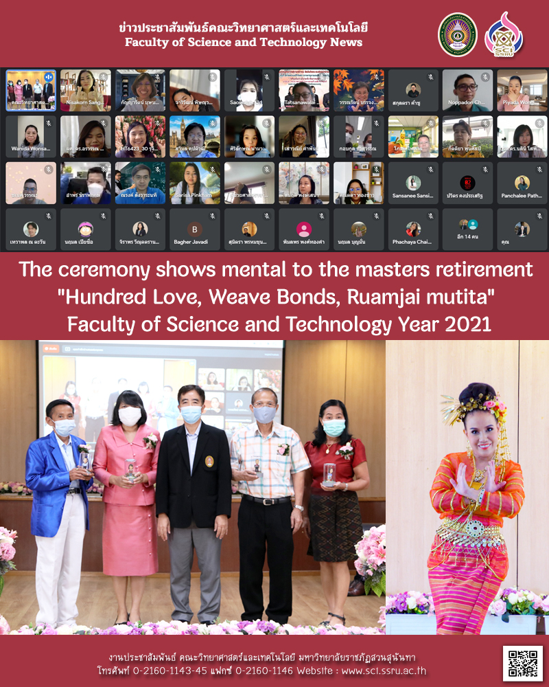 Wednesday 29 September 2021 faculty of science and technology organized a retirement event "Hundred Love, Knit the Bonds, Ruam Jai Mutita" for retired personnel for the year 2021 via google meet online. The atmosphere is warm. There is a video show of humility from the department of science and the department of environmental science