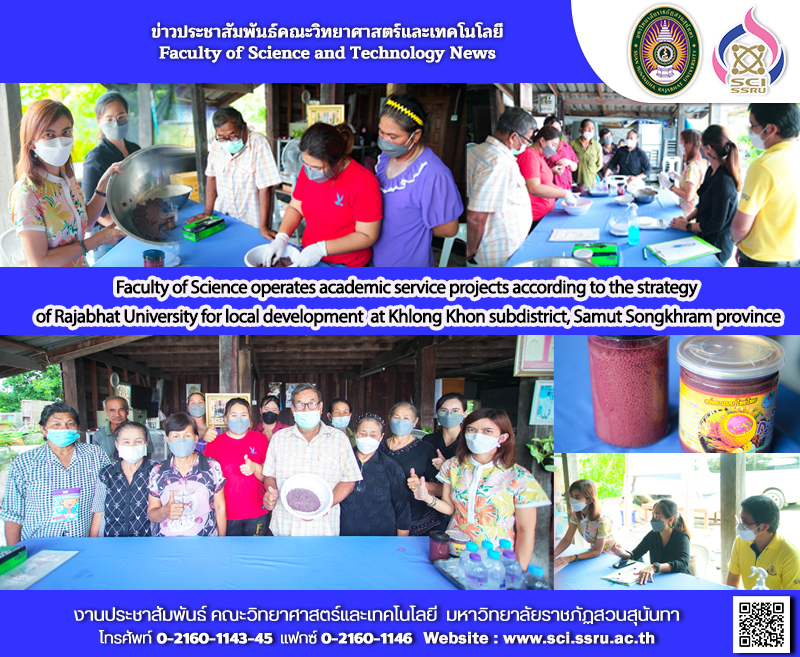 Wednesday June 1, 2022 Assistant Professor Dr.Rinrada Patanayinging, associate dean for research and academic services with staff of research and academic services visit Khlong Khon subdistrict Samut Songkhram province Implemented a project to improve quality of life and raise income through science, technology and innovation (8 households). provided knowledge on the production of shrimp paste mixed with probiotics to members of the community enterprise of Kew Ta Dam shrimp paste making occupation group, Khlong Khon subdistrict, province Samut Songkhram for households in the community develop products from existing raw materials to sell and generate income to upgrade households.