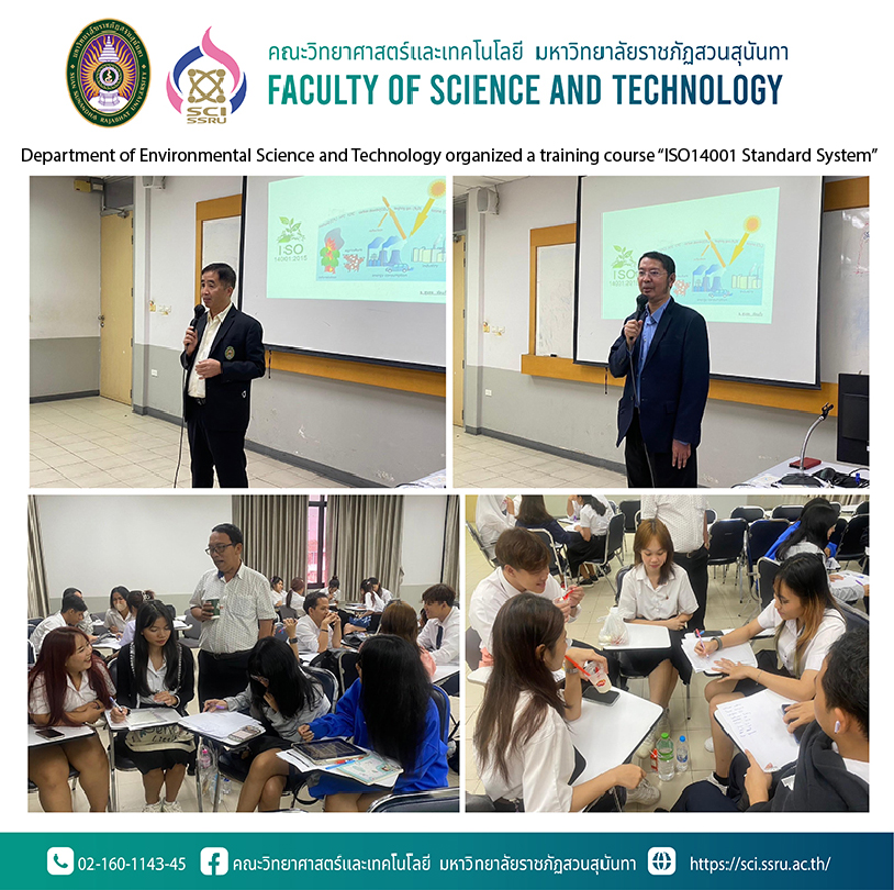 On 2 - 3 August 2024, Department of Environmental Science and Technology Faculty of Science and Technology Suan Sunandha Rajabhat University training course "ISO14001 Standard System" has been organized for students in the 2nd-4th year of the program to have knowledge in environmental management according to the ISO14001 international standard system in order to produce professional graduates to support future work. We were honored by Mr.Sunthorn Tadkaew, ISO14001 standard system expert and environmental management consultants in industrial factories as speakers, with Associate Professor Dr.Chaisri Tarasawatpipat Dean of the Faculty of Science and Technology presided over the opening of this training at room 26501 and room 26103, Faculty of Science and Technology In this regard, the output and results obtained from the training can be used to benefit personnel working in the environment and environmental management knowledge according to the international standard system ISO14001 according to the specified SDGs target group, namely Goal 11, Sustainable Cities and Communities. and goal 12: responsible production and consumption.