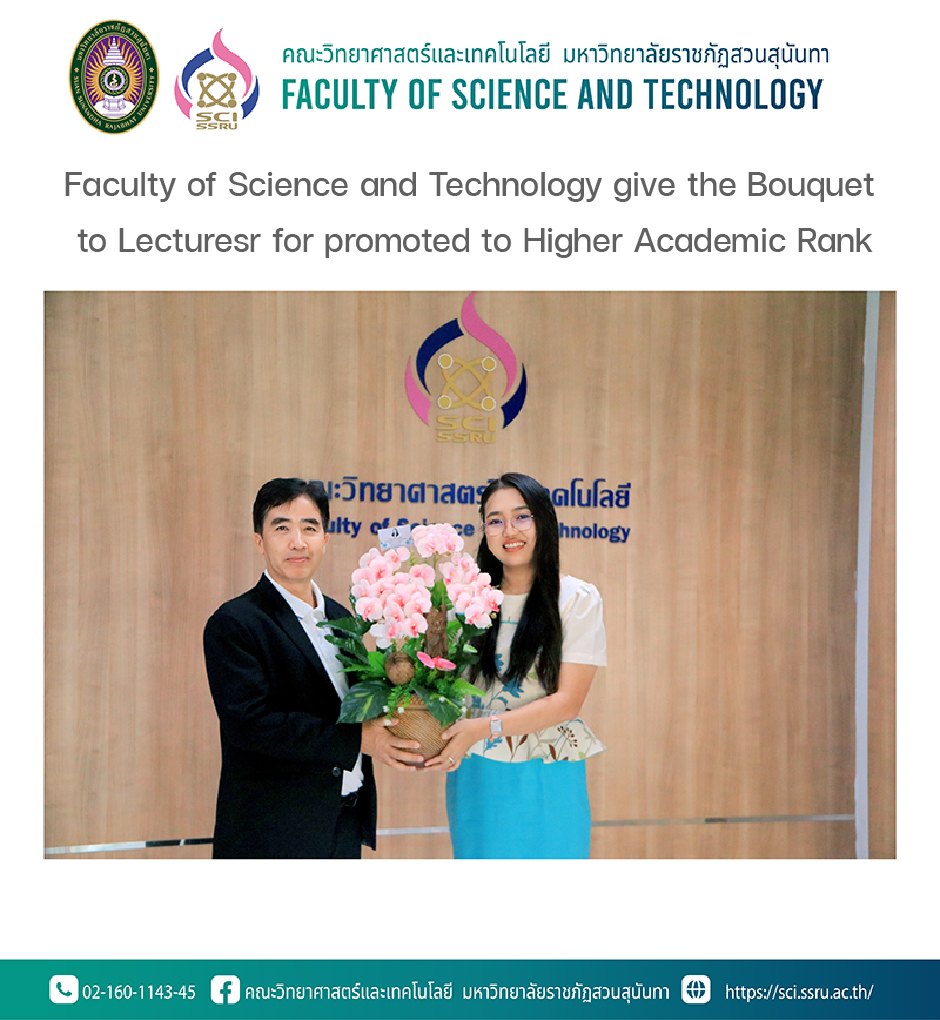 On 4th August 2023, Associate professor Dr. Chaisri Tarasawatpipat the Dean of the Faculty of Science and Technology give the bouquet to Dr.Sarisa Pinkham for promoted to Higher Academic Rank as Assistant Professor of Applied Mathematics Program in Suan Sunandha Rajabhat University Council in 7th/2023 meeting on 27th July 2023 at the Office of Dean Hall, 1st floor, Faculty of Science and Technology, Suan Sunandha Rajabhat University.