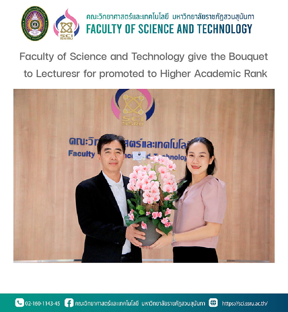 On 4th August 2023, Associate professor Dr. Chaisri Tarasawatpipat the Dean of the Faculty of Science and Technology give the bouquet to Mrs.Nunyong Fuengkajornfung for promoted to Higher Academic Rank as Assistant Professor of Home Economic Program in Suan Sunandha Rajabhat University Council in 7th/2023 meeting on 27th July 2023 at the Office of Dean Hall, 1st floor, Faculty of Science and Technology, Suan Sunandha Rajabhat University.