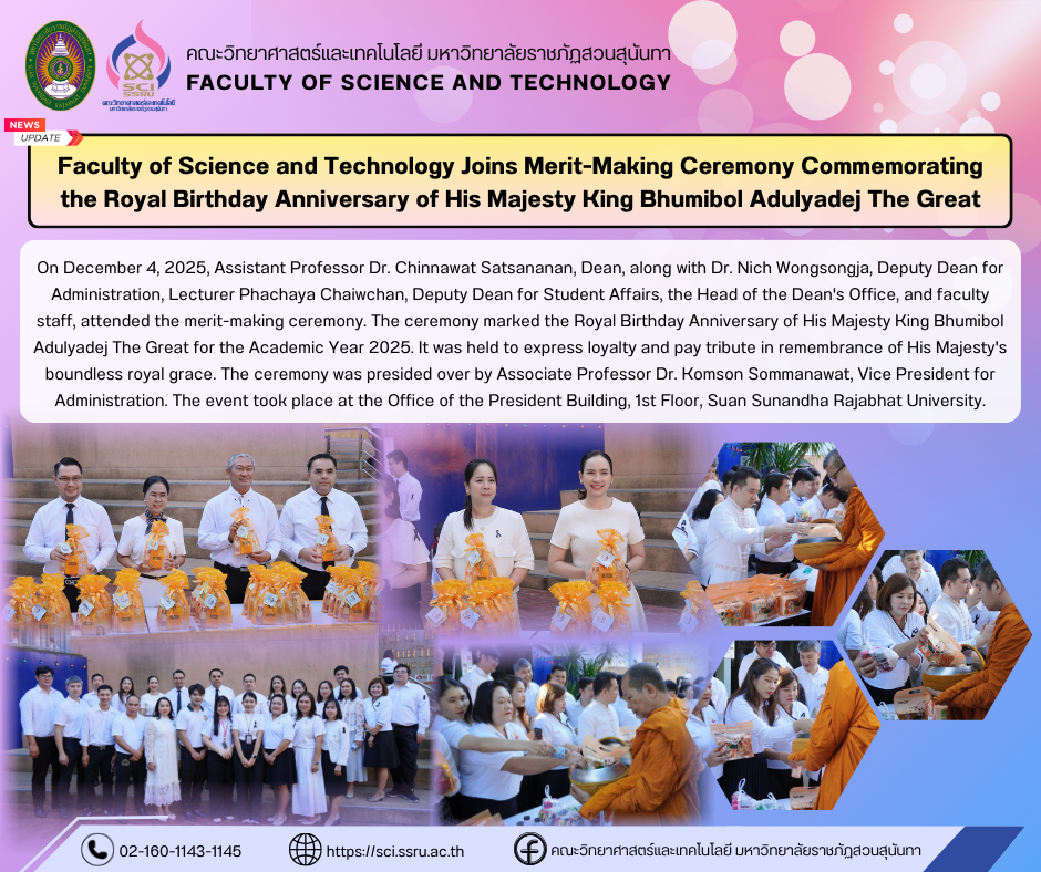 On December 4, 2025, Assistant Professor Dr. Chinnawat Satsananan, Dean, along with Dr. Nich Wongsongja, Deputy Dean for Administration, Lecturer Phachaya Chaiwchan, Deputy Dean for Student Affairs, the Head of the Dean's Office, and faculty staff, attended the merit-making ceremony. The ceremony marked the Royal Birthday Anniversary of His Majesty King Bhumibol Adulyadej The Great for the Academic Year 2025. It was held to express loyalty and pay tribute in remembrance of His Majesty's boundless royal grace. The ceremony was presided over by Associate Professor Dr. Komson Sommanawat, Vice President for Administration. The event took place at the Office of the President Building, 1st Floor, Suan Sunandha Rajabhat University.