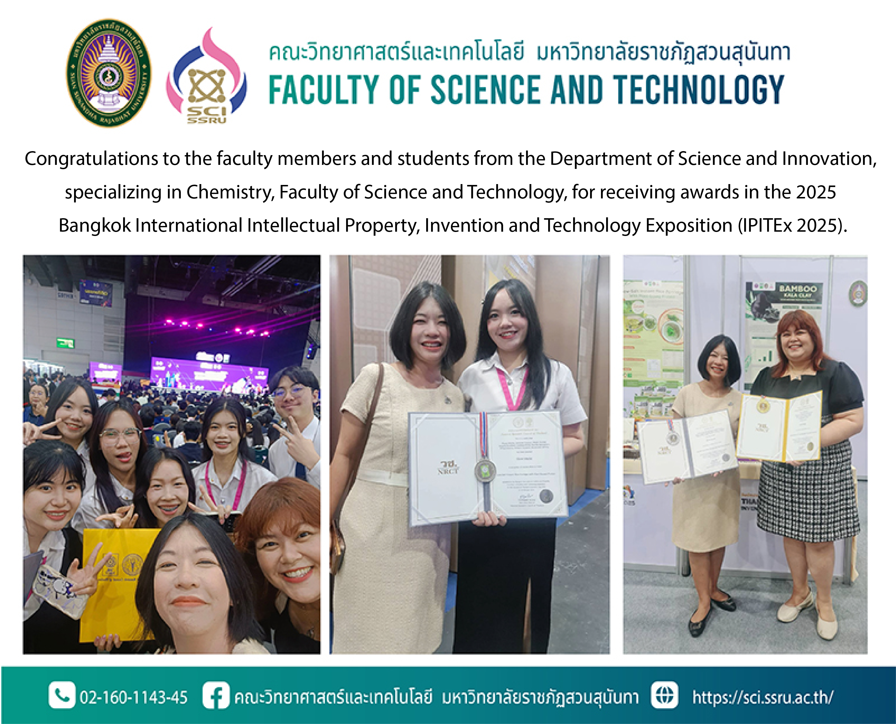 Congratulations to the faculty members and students from the Department of Science and Innovation, specializing in Chemistry, Faculty of Science and Technology, for receiving awards in the 2025 Bangkok International Intellectual Property, Invention and Technology Exposition (IPITEx 2025).