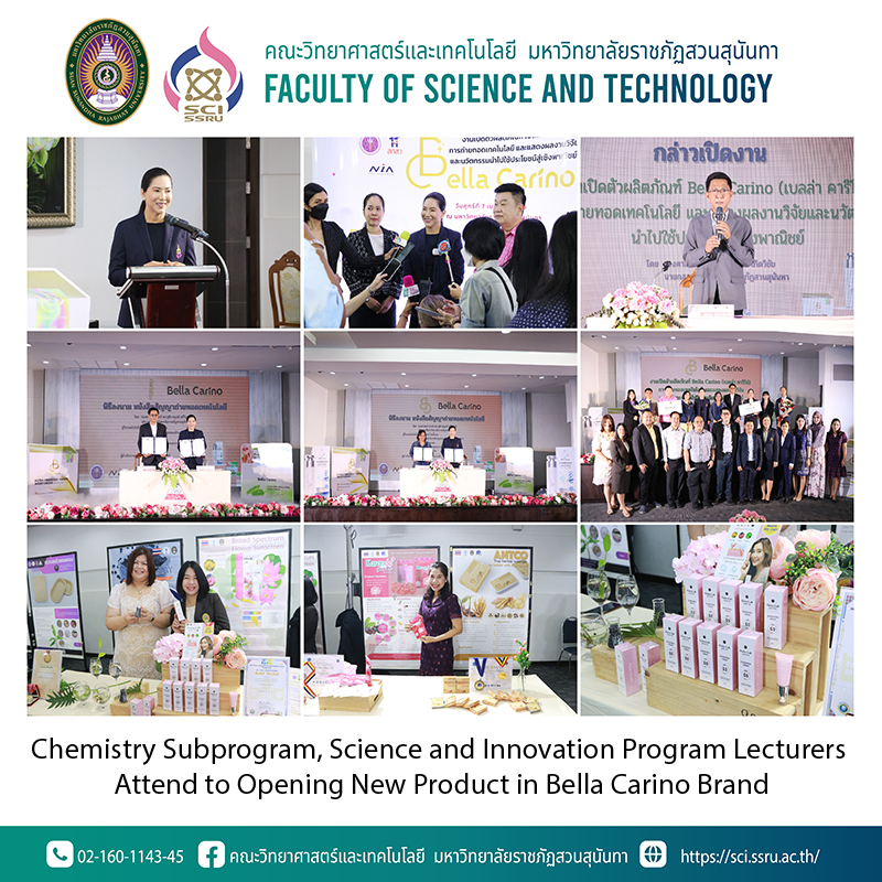 On 7th from 9.00 a.m. to 12.00 a.m., the lecturers of the Chemistry Subprogram, Science and Innovation Program, Faculty of Science and Technology, Suan Sunandha Rajabhat University attend the opening of a new product under the Bella Carino brand, an instruction technology signing ceremony, and research and innovation for commercial usage. This ceremony has Associate Professor Dr.Luedech Girdwichai the Chairman of the University Council, as the Opening Ceremony Chairman, and Associate Professor Dr.Chutikarn Sriviboon the President, as the Reporter. This event has a signing instruction technology contract ceremony about "The Composition and Production of Paper from Banana Fiber" with Mr.Chakkarin Pophrom the Gros Michel banana community enterprise chairman, Sang Khom District, Udon Thani Province, and a signing instruction technology contract ceremony about "Kombucha Drinking Powder from Bastard Teak" with Mrs.Keaw Jordnok the Herbal Fermented Enzyme for Healthy, Ban Nong Ped community enterprise. This ceremony has been attended by lecturers of the Faculty of Science and Technology, such as Assistant Professor Dr. Wanida Wonsawat, Dr.Ploysai Ohama, and Assistant Professor Dr. Jitlada Chumee which organized by the Institute of Research and Development at Chorkaew Hall, 5th floor, 31 building.