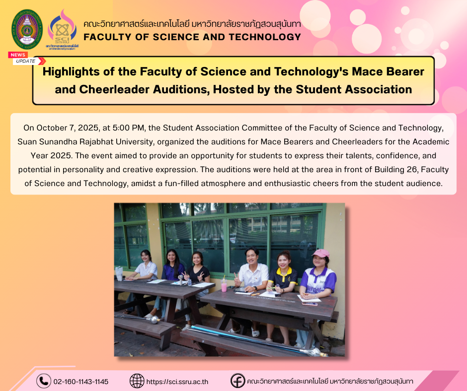 On October 7, 2025, at 5:00 PM, the Student Association Committee of the Faculty of Science and Technology, Suan Sunandha Rajabhat University, organized the auditions for Mace Bearers and Cheerleaders for the Academic Year 2025. The event aimed to provide an opportunity for students to express their talents, confidence, and potential in personality and creative expression. The auditions were held at the area in front of Building 26, Faculty of Science and Technology, amidst a fun-filled atmosphere and enthusiastic cheers from the student audience.