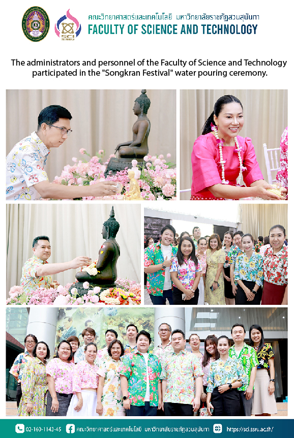 On April 8, 2025, at 11:00 AM, Assistant Professor Dr. Chinnawat Sassananan, Dean of the Faculty of Science and Technology, along with the Associate Deans, Head of Office, faculty members, and staff of the Faculty, participated in the "Songkran Festival" water pouring ceremony held at the Hall of Honor, 1st Floor, Building 32, Suan Sunandha Rajabhat University.
