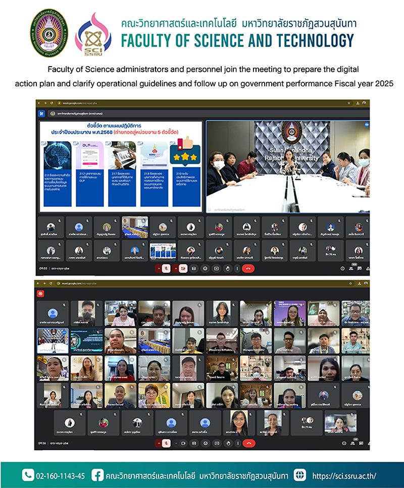 October 8, 2024 at 9:00 a.m., led by Assistant Professor Dr.Thalisa Niammanee, Deputy Dean for Administration along with relevant Faculty of Science and Technology personnel join the meeting to prepare the digital action plan and clarify operational guidelines and follow up on government performance Fiscal year 2025 with Associate Professor Dr.Sirilak Ketchai, Director of the Office of Academic Resources and Information Technology chairing the meeting to clarify operational guidelines and follow up on progress reports on performance according to indicators according to the action plan Fiscal year 2025 of the Office of Academic Resources and Information Technology Suan Sunandha Rajabhat University hold a meetings online through Google Meet.