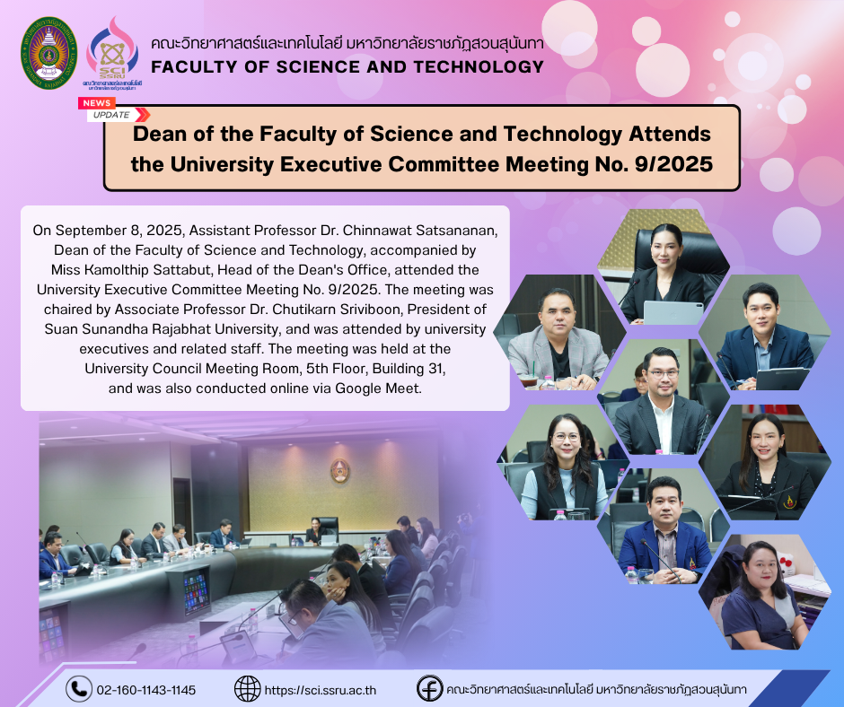 On September 8, 2025, Assistant Professor Dr. Chinnawat Satsananan, Dean of the Faculty of Science and Technology, accompanied by Miss Kamolthip Sattabut, Head of the Dean's Office, attended the University Executive Committee Meeting No. 9/2025. The meeting was chaired by Associate Professor Dr. Chutikarn Sriviboon, President of Suan Sunandha Rajabhat University, and was attended by university executives and related staff. The meeting was held at the University Council Meeting Room, 5th Floor, Building 31, and was also conducted online via Google Meet.