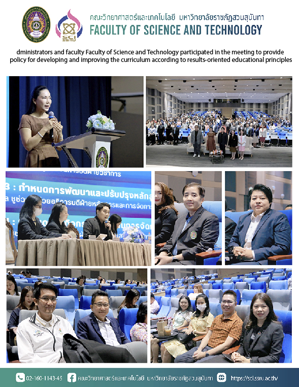 On November 8,Friday 2024 Associate Professor Dr.Chaisri Tarasawatpipat Dean of the Faculty of Science and Technology along with Assistant Professor Dr Sopit Sawangjit, Deputy Dean for Academic Affairs Faculty of Science and Technology and educational service officers attended the meeting to present development policies and improve the curriculum according to educational guidelines that focus on results (Outcome-based Education: OBE) to support quality assurance inspection according to AUN-QA Version 4.0 quality criteria simultaneously for every curriculum to be in the same direction and standard throughout the university and the bachelor's degree program must be a professional or practical bachelor's degree program by delivering the policy this time, we were honored by Associate Professor Dr.Chutikarn Sriwiboon, President, presided over and Assistant Professor Dr.Natthapat Kaewrattanaphat. Vice Rector for Academic Affairs Assistant Professor Dr.Chutima Maniwatana, Assistant Rector for Academic Affairs and Assistant Professor Kornkamon Chuchuay, Assistant Rector for Curriculum and Instructional Management,were speakers this time at Sunanthanusorn Auditorium. Suan Sunandha Rajabhat University.