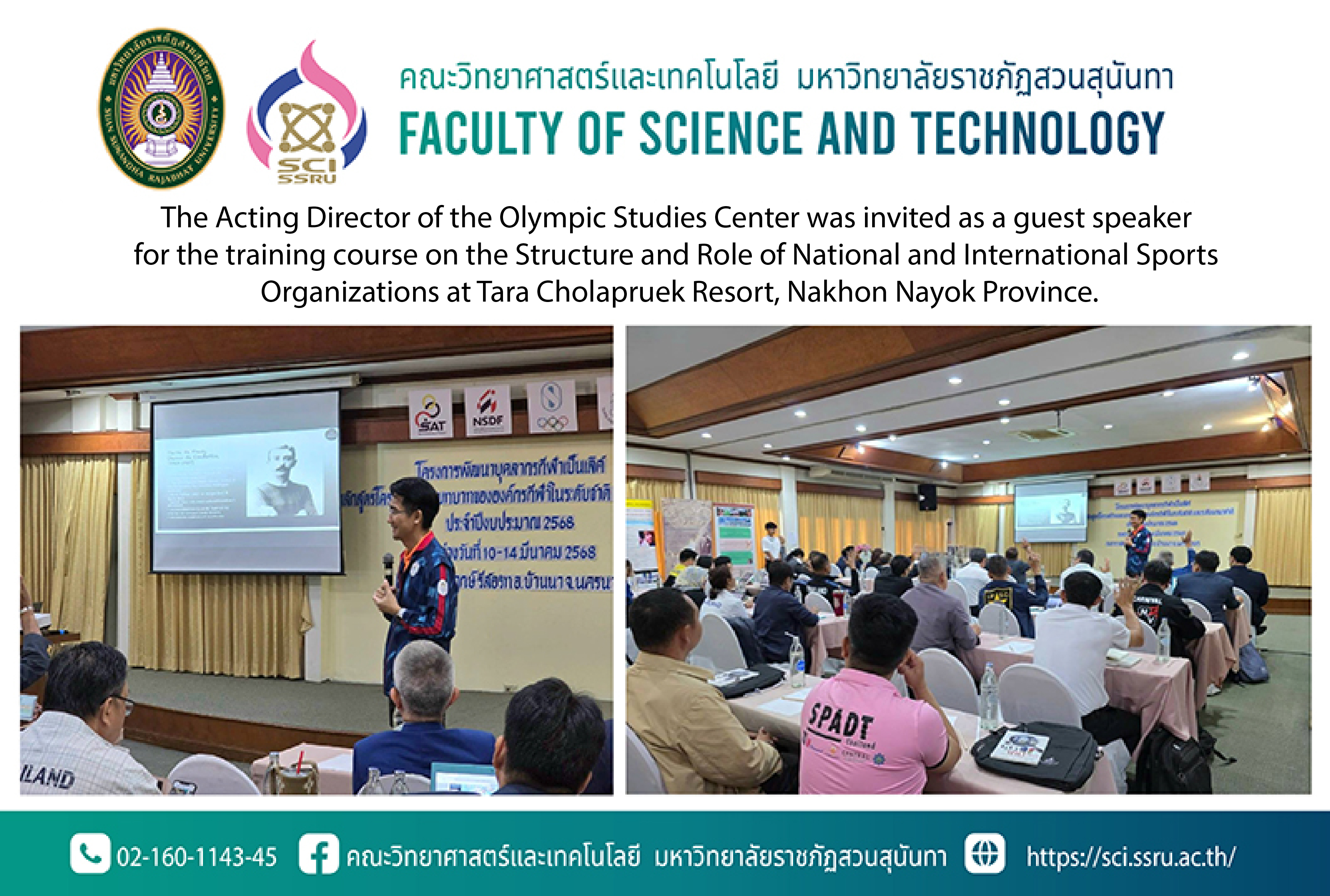 On March 10, 2025, Assistant Professor Dr. Suriyan Sompong, Acting Director of the Olympic Education Center, Faculty of Science and Technology, Suan Sunandha Rajabhat University, was invited as a speaker on the topic of "Olympic Science" in the 2nd cohort of the course "Structure and Roles of National and International Sports Organizations." The course was organized by the Sports Authority of Thailand in collaboration with the Thailand Olympic Academy. Its purpose was to develop the sports personnel of the sports associations of Thailand by providing them with knowledge about Olympic strategies, Olympic ideals, and Olympic values. This knowledge is intended to be applied to their work planning for efficiency and sustainability. The event took place at Tara Cholapruek Resort in Nakhon Nayok Province.