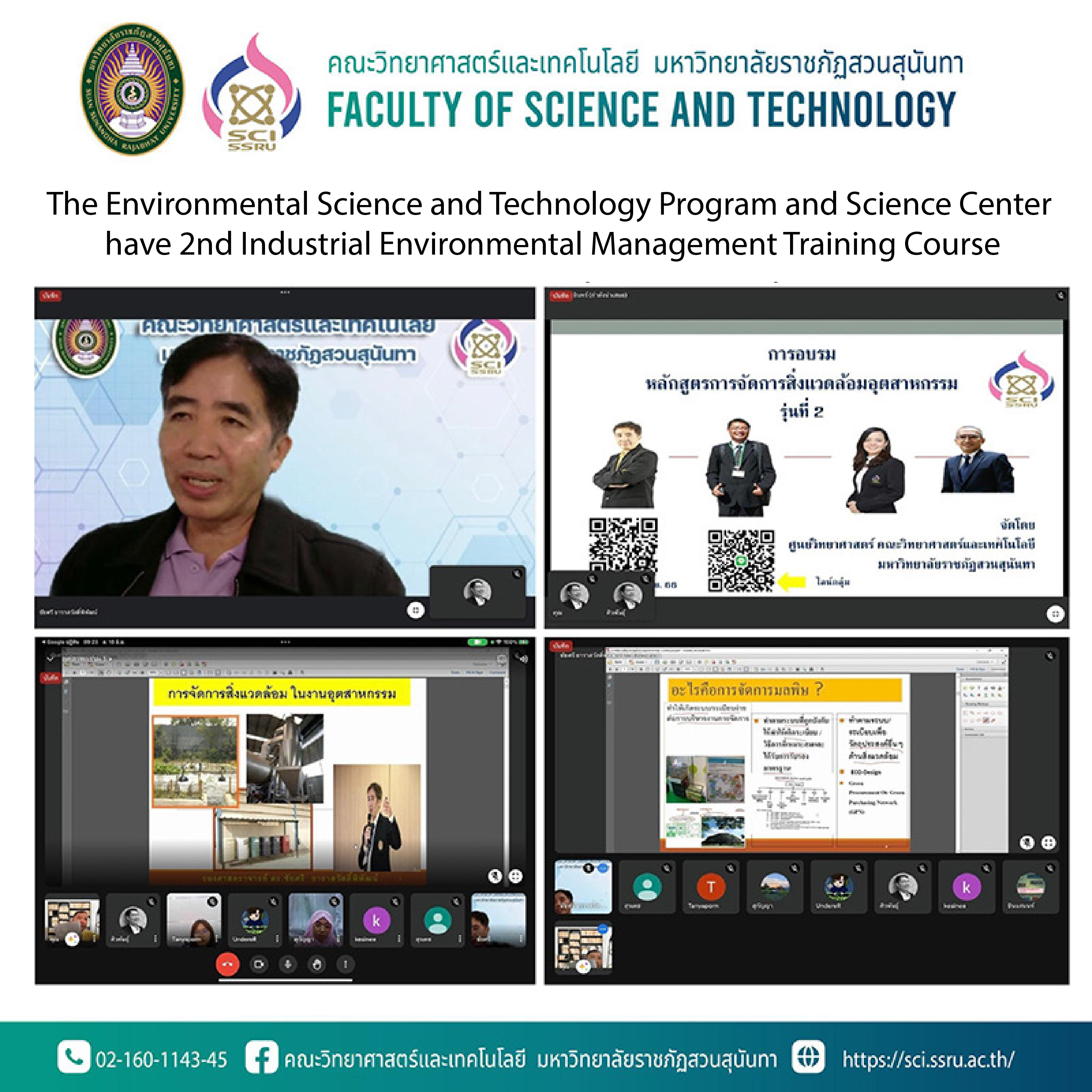On 10th June 2023, the Environmental Science and Technology Program and Science Center, Faculty of Science and Technology, Suan Sunandha Rajabhat University have organized short course training to Reskill and Upskill for Environmental Personnel in ‘2nd Industrial Environmental Management’ on Saturday (first day) by Online Training with Google Meet application 8 times totally 48 hours. On first time honored Associate Professor Dr.Chaisri Tarasawatpipat the Dean of the Faculty of Science and Technology as Chairman and lecturing ‘Overview of Industrial Environmental Management and Related Laws’, which attracted the attention of external personnel to participate in this training.