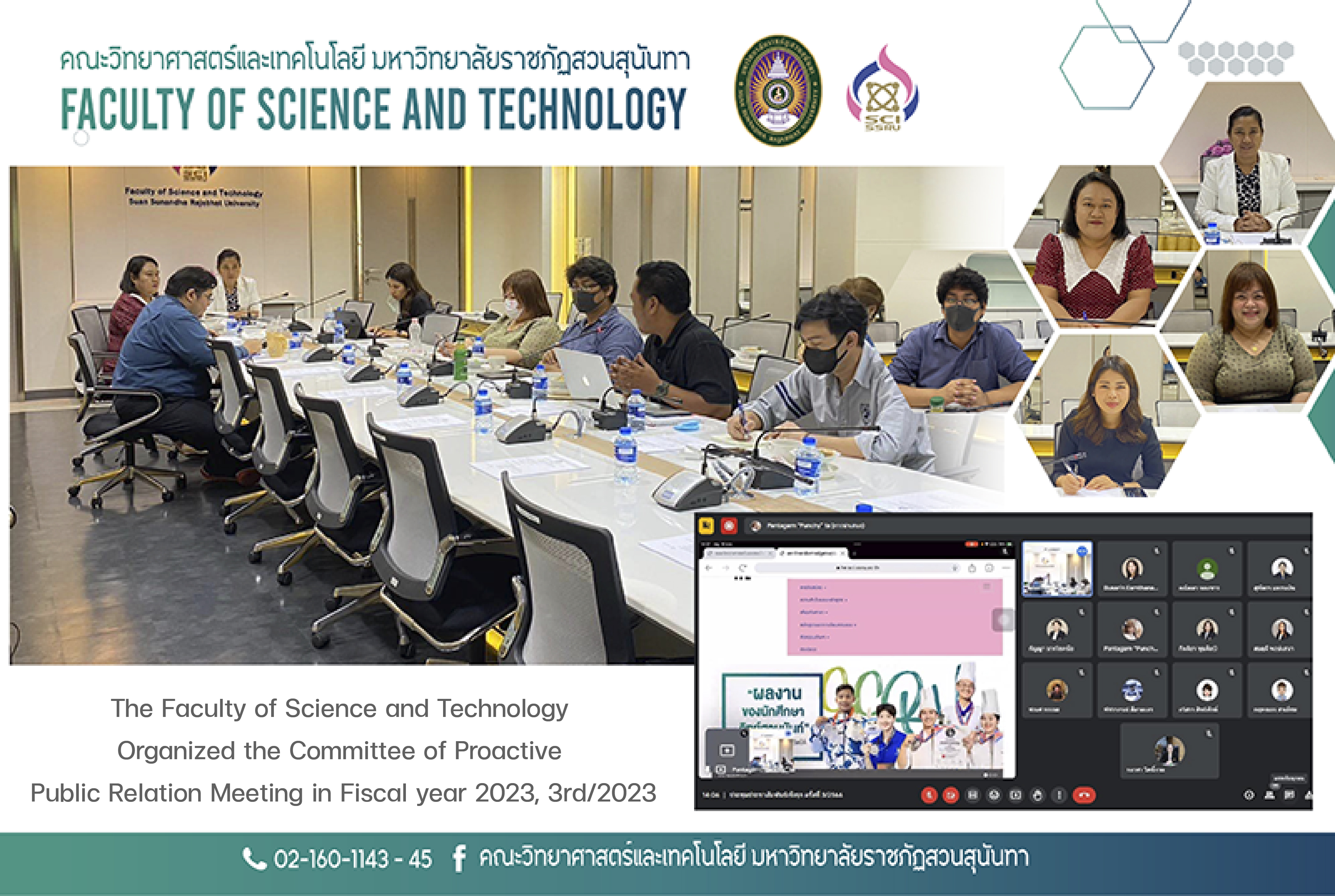 On 10th August 2023, the Faculty of Science and Technology organized the Committee of Proactive Public Relation Meeting 3rd/2023 by Assistant Professor Dr.Talisa Niammanee, Associate Dean for Administration as Chairman. This meeting has Programs agent and relative staff attended at 26109 meeting room, 1st floor, Faculty of Science and Technology, and Online Meeting by Google Meet application. The topics of meeting as follow Consideration of guidelines for Program’s website updates, Public Relations/Guidance Plan for Academic Year 2024, and the faculty promotion video.