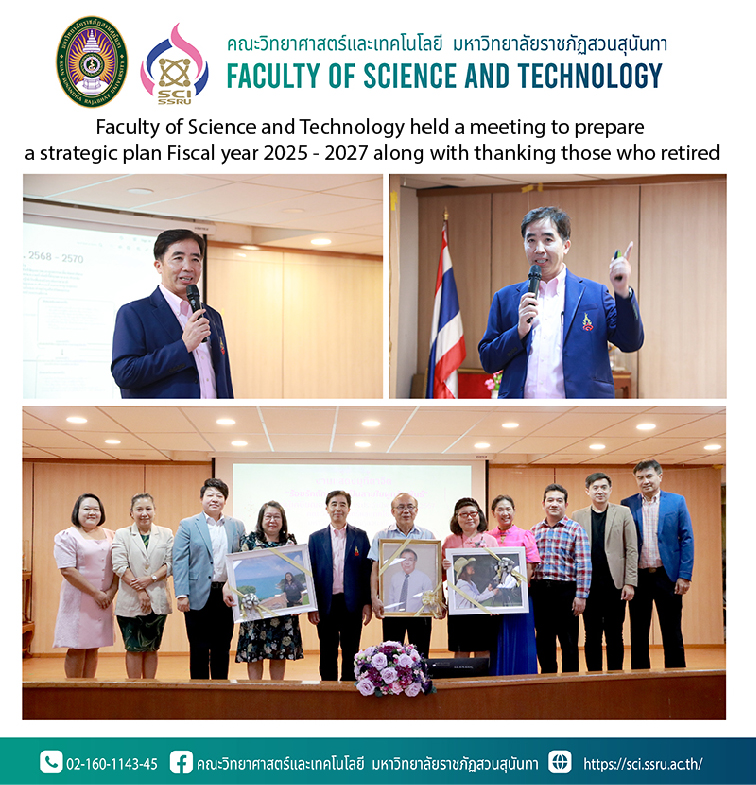 On September 10, 2024, led by Associate Professor Dr.Chaisri Tarasawatpipat Dean of the Faculty of Science and Technology chairing the opening of the meeting to clarify operational guidelines and strategic planning. Fiscal year 2025 - 2027 of the faculty along with administrators and faculty and academic support personnel participated in the said meeting the chairman of the meeting expressed his gratitude to 3 people who retired from the Faculty for the year 2024, including Professor Narumon Pieasue, lecturer in the Department of Home Economics Assistant Professor Dr.Wichayaruj Atsada Lertwong Lecturer in Physics Department of Science and Innovation and Assistant Professor Nithinat Charoenphokarat, lecturer in the Department of Environmental Science and Technology at meeting room 26103, 1st floor, Faculty of Science and Technology. Suan Sunandha Rajabhat University.