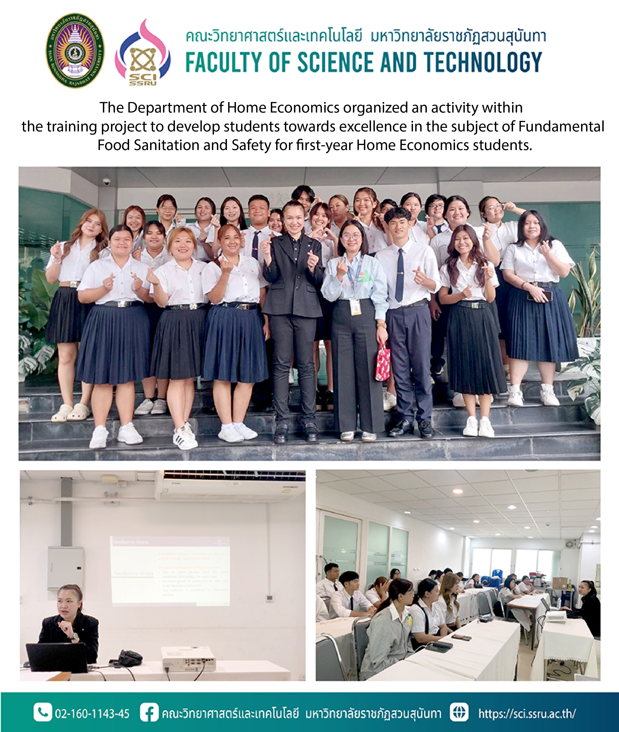 The Department of Home Economics organized a training workshop under the Student Development for Excellence Project, focusing on the subject of Food Sanitation and Safety. The workshop was conducted for first-year students of the Home Economics program. Mr. Pitthinan Chuanprasit, Hygiene Manager at The Sukhothai Bangkok Hotel, was invited as a guest speaker to lecture on hotel sanitation and safety, the application of food safety management systems GAP, GHP, GMP, HACCP, Halal standards, and relevant legislation. The event took place at Science Building 23, Faculty of Science and Technology.