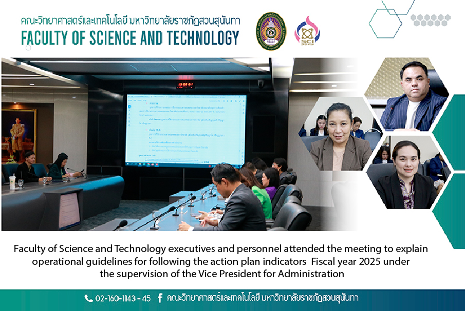 On 11 September, 2024 at 1:30 p.m., led by Assistant Professor Dr.Thalisa Niammanee, Deputy Dean for Administration along with Ms.Radasa Phojad, Head of General Administration the Faculty of Science and Technology attended the meeting to explain operational guidelines according to the action plan indicators. Fiscal year 2025 with Asst.Prof. Dr.Khomsan Somanawat, Vice President for Administration chaired the meeting at the council meeting room, 5th floor, Building 31, Suan Sunandha Rajabhat University.