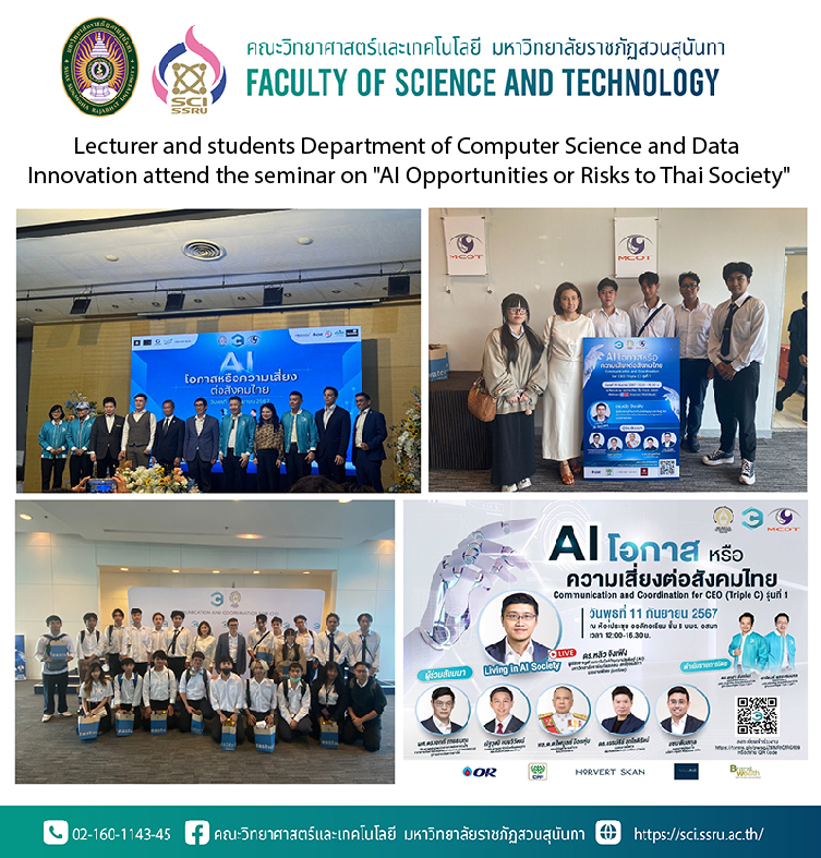 On Wednesday, September 11, 2024, teachers and 2nd - 4th year students in the Department of Computer Science and Data Innovation attended the seminar on "AI Opportunities or Risks to Thai Society" organized by participants of the "Communication and Coordination for CEO" (Triple C) course, Batch 1, Issara Institute, Media Development Foundation of Thailand at the auditorium meeting room, 6th floor, MCOT PCL., we were honored by famous speakers as follows:
