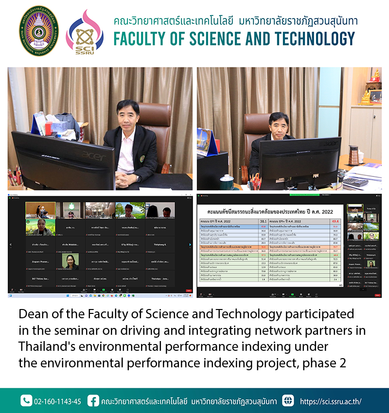 On July 12, 2023, Associate Professor Dr.Chaisri Tarasawatpipat Dean of the Faculty of Science and Technology Suan Sunandha Rajabhat University participated in the seminar on driving and integrating network partners for the indexing of Thailand's environmental performance under the environmental performance Index project, phase 2, organized by the Office of Natural Resources and Environmental Policy and Planning. In order to prepare a management plan for the Environmental Performance Index (EPI) of Thailand, No. 1-7, and draft a variable framework for indicators under EPI via Zoom online system.