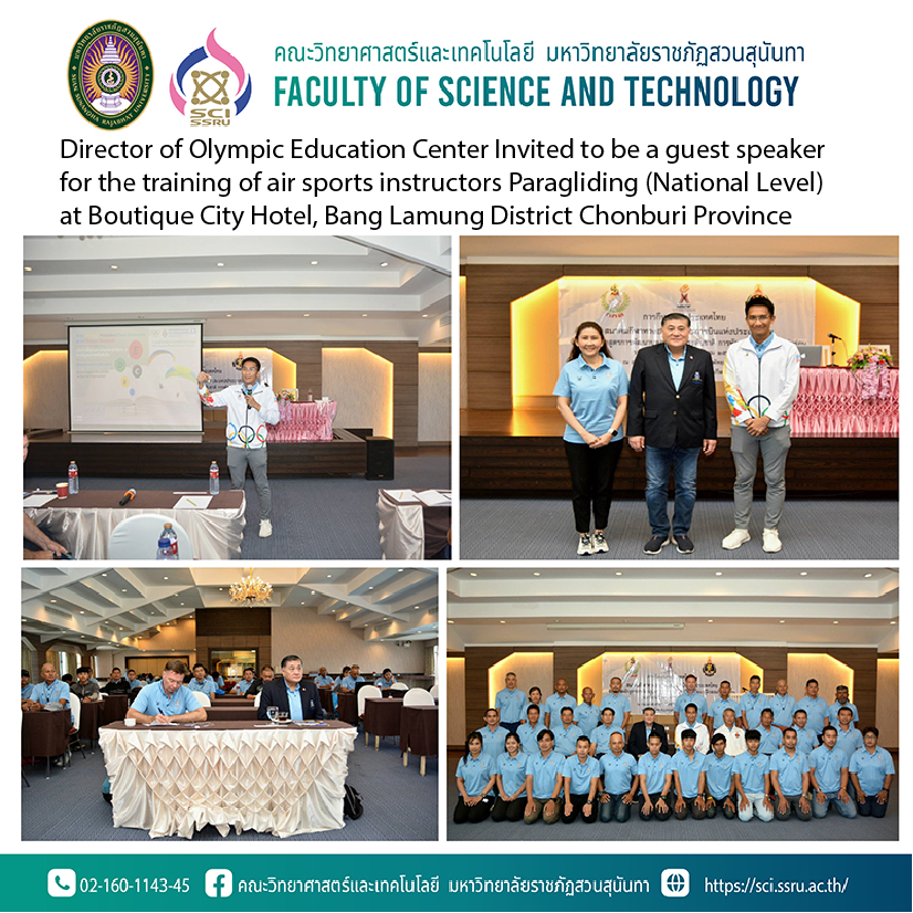 July 12, 2023, Assistant Professor Dr.Suriyan Sompong, Director of the Olympic Education Center Faculty of Science and Technology Suan Sunandha Rajabhat University Invited to be a guest speaker on the topic "Olympism" (Olympism) in the course "Air Sports Instructor Paragliding type" with Colonel Weerayut Disyasarin, President of the Air Sports and Aviation Association of Thailand under the royal patronage presided over the opening of the training The objective of the training is to develop air sports personnel to gain knowledge about Olympic values and sports ethics. to be applied in planning sports training effectively and sustainably.