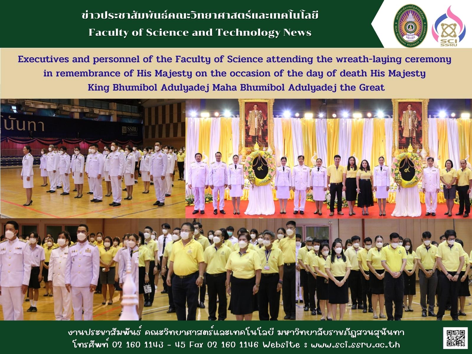 Wednesday October 12, 2022 Associate Professor Dr.Chaisri Tarasawatpipat dean of the faculty of science along with personnel of the faculty of science and technology attended the wreath-laying ceremony in remembrance of His Majesty the King on the occasion of the day of death His Majesty King Bhumibol Adulyadej Maha Bhumibol Adulyadej the Great, with Associate Professor Dr.Chutikarn Sriwiboon, President of Suan Sunandha Rajabhat University presided over the ceremony along with administrators, faculty members, staff, students and students attended the ceremony at the Health and Sports Center Building, 4th floor, Suan Sunandha Rajabhat University.