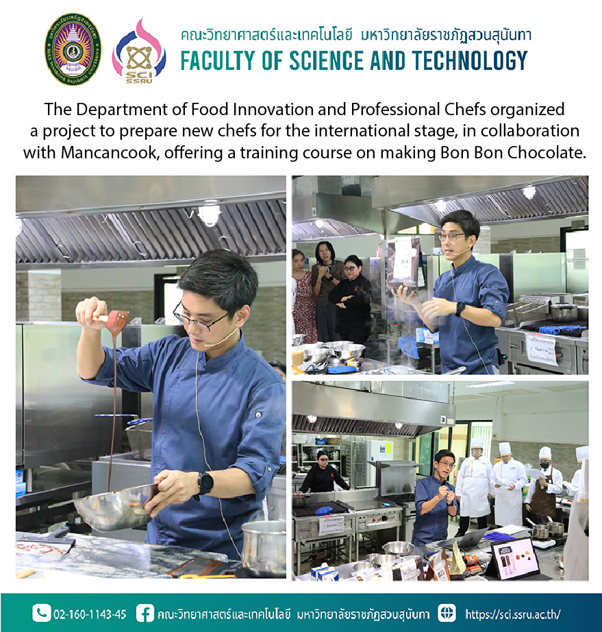 On February 14, 2025, from 12:00 PM to 3:00 PM, the Department of Food Innovation and Professional Chef organized a project to prepare new chefs for the global stage in collaboration with Mancancook. The training focused on making Bon Bon Chocolate to equip graduates with the skills needed to immediately enter the workforce, aligning their competencies with the demands of the job market in the field of sweet foods, such as chocolate making. This initiative enables students to develop a career in this field and prepares them for future job opportunities. The event was honored by Chef Khomsan Sant Asvanuchit as the instructor. The training took place in Room 2532, Building 23, Faculty of Science and Technology.