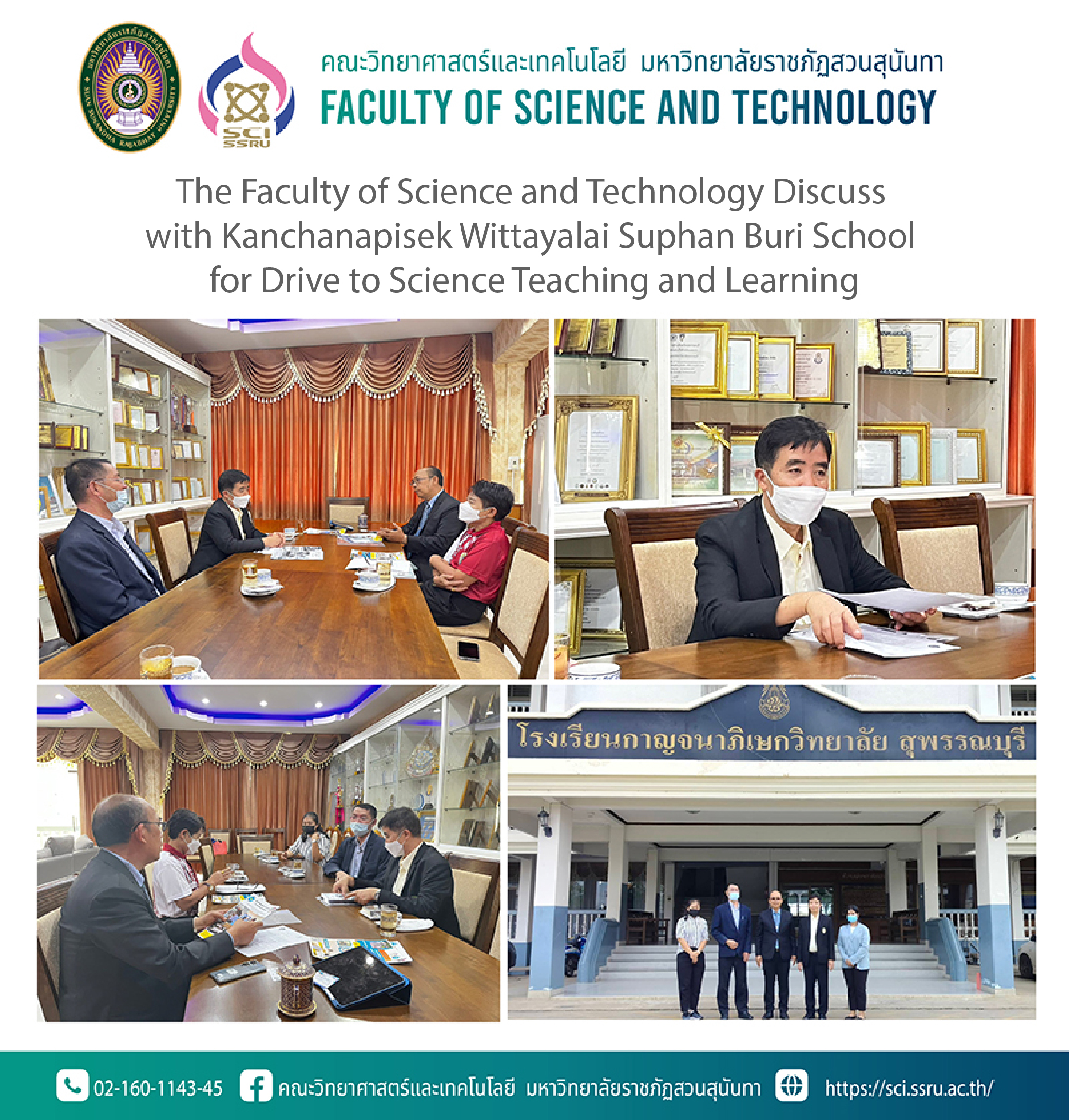 On 14th September 2023, the Faculty of Science and Technology, Suan Sunandha Rajabhat University by Associate Professor Dr.Chaisri Tarasawatpipat the Dean of the Faculty of Science and Technology, and Associate Sivaphan Choo-In the lecturer of Environmental Science and Technology Program discuss with Dr.Viroj Chaipakdee the Director of the Kanchanapisek Wittayalai Suphan Buri School about memorandum of understanding (MoU) to drive effective Science and Technology teaching and learning at the Kanchanapisek Wittayalai Suphan Buri School.