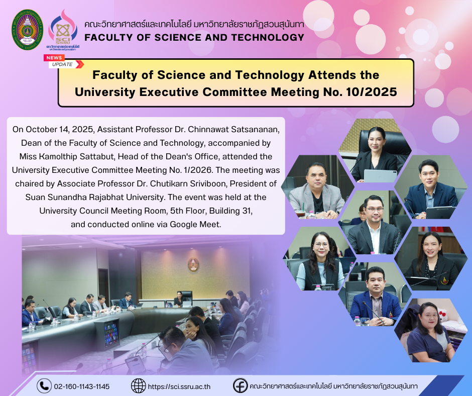 On October 14, 2025, Assistant Professor Dr. Chinnawat Satsananan, Dean of the Faculty of Science and Technology, accompanied by Miss Kamolthip Sattabut, Head of the Dean's Office, attended the University Executive Committee Meeting No. 1/2026. The meeting was chaired by Associate Professor Dr. Chutikarn Sriviboon, President of Suan Sunandha Rajabhat University. The event was held at the University Council Meeting Room, 5th Floor, Building 31, and conducted online via Google Meet.