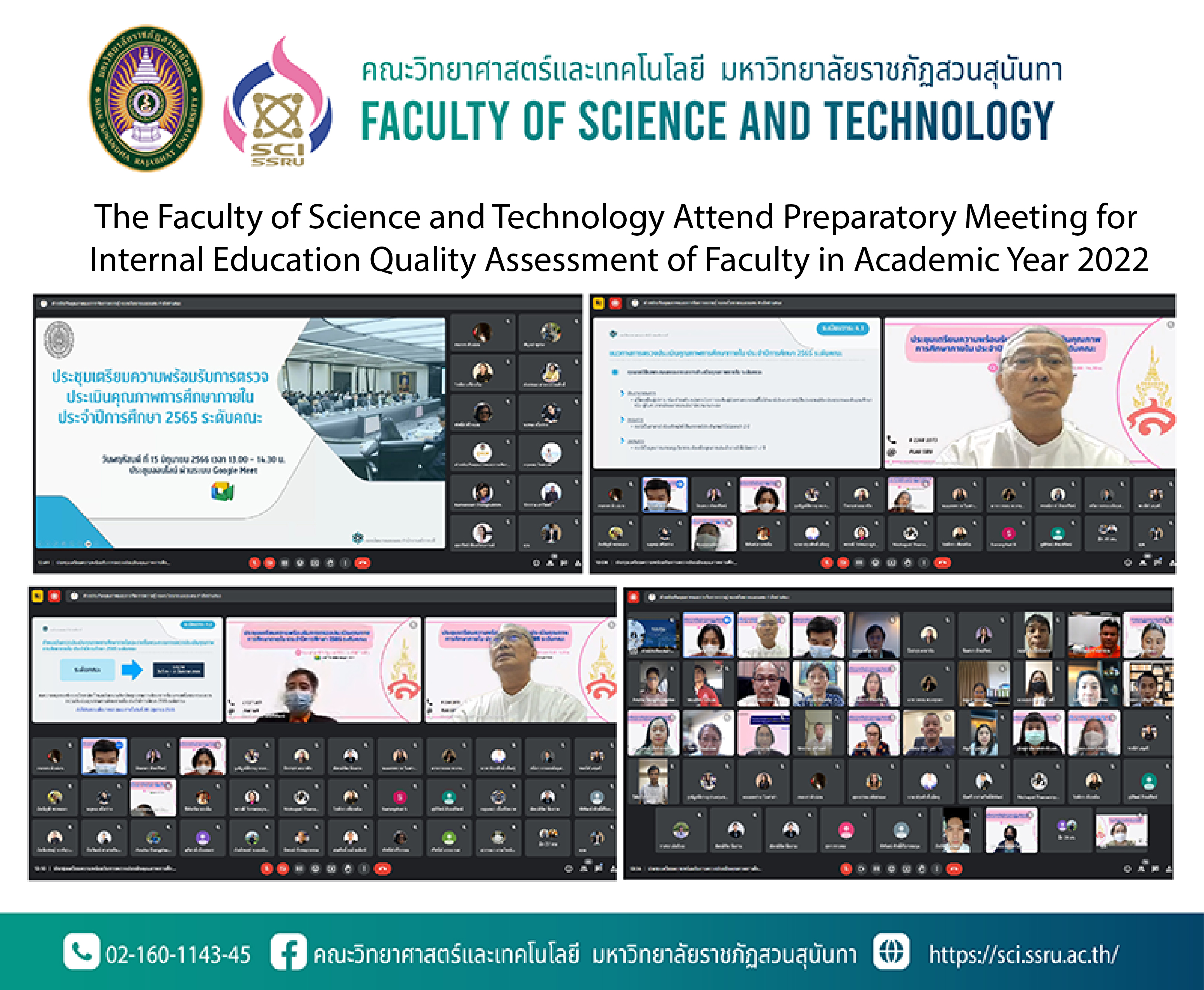On 15th June 2023 at 1 p.m., the Faculty of Science and Technology administrators by Associate Professor Dr.Chaisri Tarasawatpipat the Dean of the Faculty of Science and Technology, Assistant Professor Dr.Chinnawat Satsananan the Deputy Dean for Planning and Quality Assurance, Mrs.Radasa Pojard who responding quality assurance of the faculty staff attend preparatory meeting for Internal Education Quality Assessment of Faculty in Academic Year 2022 with Online meeting by Google Meet application. This is to prepare for the Faculty Assessment in August 2023 by Associate Professor Dr.Wittaya Mekkham the Vice-President for Planning and Quality Assurance as Chairman which is organized by the Division of Planning and Policy, Office of President.