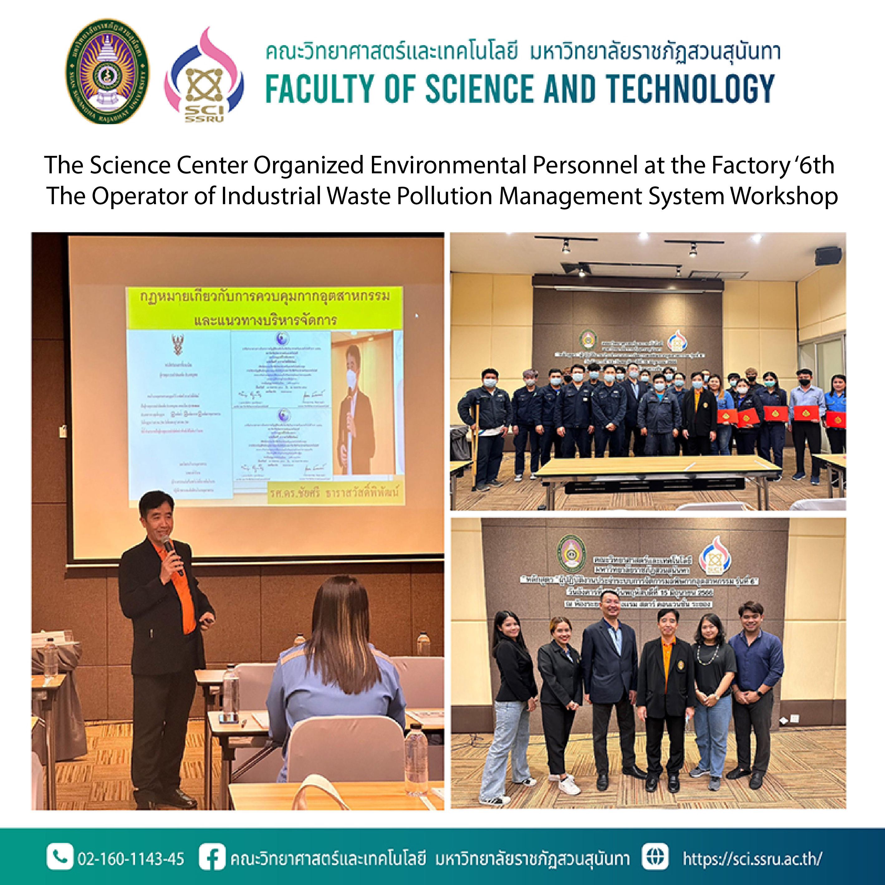 The Science Center, Faculty of Science and Technology, Suan Sunandha Rajabhat University organized environmental personnel at the factory ‘6th The Operator of Industrial Waste Pollution Management System’ workshop from 13th – 15th June 2023 at Rayong 1 room, Star Convention Center Hotel, Rayong. This workshop honored Associate Professor Dr.Chaisri Tarasawatpipat the Dean of the Faculty of Science and Technology lecture on ‘Laws on Industrial Waste Control and Management Guidelines’, Associate Professor Sivapan Choo-In the lecturer of the Environmental Science and Technology program lecture on ‘Industrial Waste and Industrial Waste Pollution Situation’, and Dr.Thantip Panmetarit the Industrial Waste Management Specialist lecture on ‘Industrial Waste Pollution Management Theory’. This workshop has been well received by environmental scholars and environmental officials from industrial factories such as IRPC.