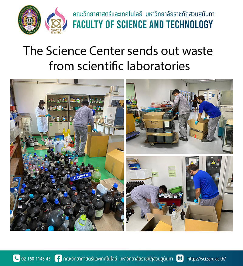 Friday, July 14, 2023, the Science Center Faculty of Science and Technology Suan Sunandha Rajabhat University Assistant Professor Dr.Pantip Kayee (Director of the Science Center) has sent waste from the scientific laboratory to be disposed of. expired chemical chemical container from the scientific laboratories of the Science Center by agencies authorized to transport and dispose of hazardous waste from outside. come in to collect hair and remove it with the correct method.
