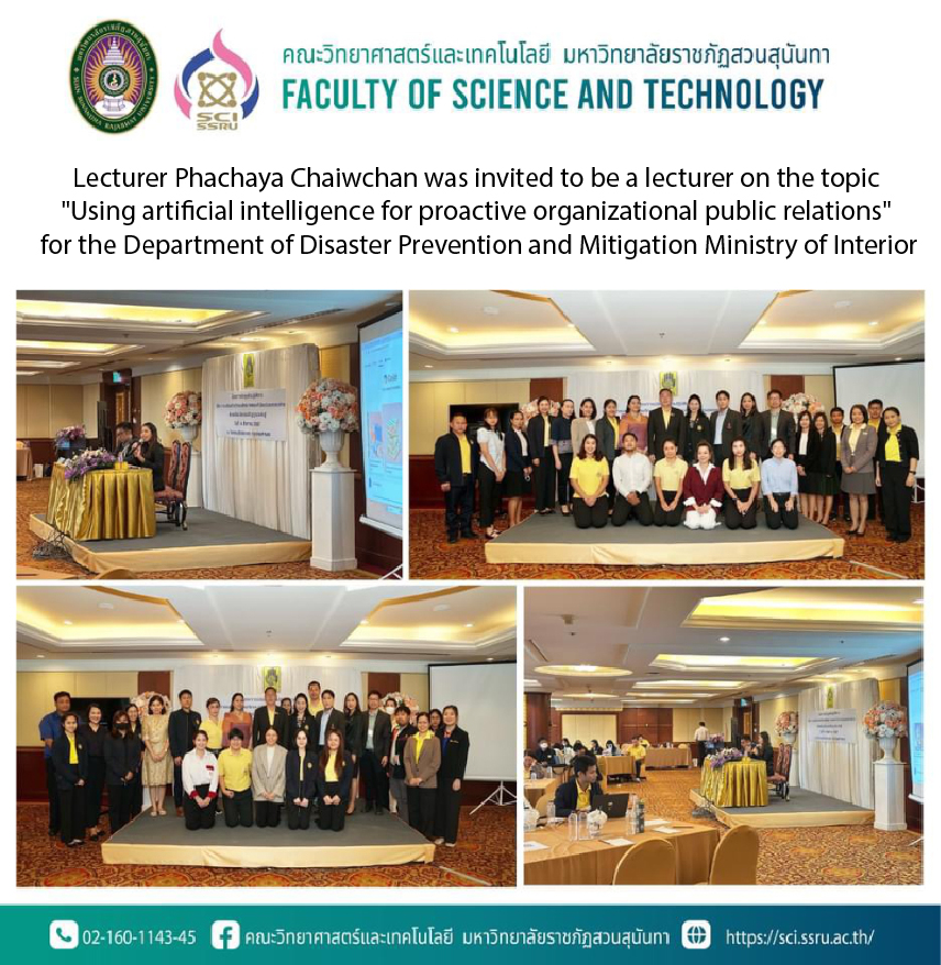 On Wednesday, August 14, 2024, from 9:00 a.m. - 4:00 p.m., Lecturer Phachaya Chiewchan, Head of the Digital Innovation and Content Management Department Faculty of Science and Technology Suan Sunandha Rajabhat University Invited to be a lecturer on the topic "Using artificial intelligence for proactive organizational public relations" in the workshop project. Strengthening future skills and shared organizational values with the power of artificial intelligence innovation, organized by the Department of Disaster Prevention and Mitigation. Ministry of Interior Its main objective is to promote skills for personnel to have thought processes that promote and develop their own potential. It promotes collective behavior in driving the organization create motivation for personnel in the organization to adhere to core values strengthen good relationships among personnel in the organization and increase efficiency in communication and teamwork promoting and supporting guidelines according to the Sustainable Development Goals (SGCs) at Patcharapa Room, 11th floor, Building 2, Prince Palace Hotel Bangkok.