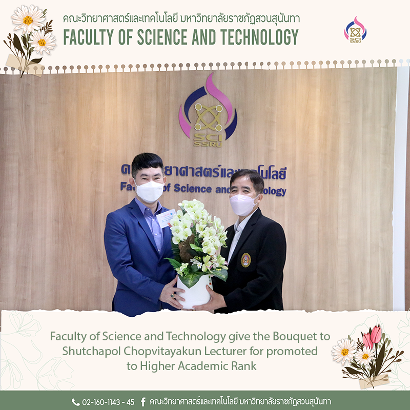 On 15th November 2022, Associate professor Dr. Chaisri Tarasawatpipat the Dean of the Faculty of Science and Technology give the bouquet to Shutchapol Chopvitayakun Lecturer for promoted to Higher Academic Rank as Assistant professor of Information Technology at the Office of Dean Hall, 1st floor, Faculty of Science and Technology, Suan Sunandha Rajabhat University.