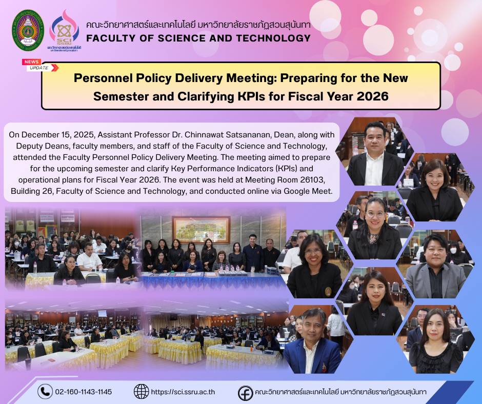 On December 15, 2025, Assistant Professor Dr. Chinnawat Satsananan, Dean, along with Deputy Deans, faculty members, and staff of the Faculty of Science and Technology, attended the Faculty Personnel Policy Delivery Meeting. The meeting aimed to prepare for the upcoming semester and clarify Key Performance Indicators (KPIs) and operational plans for Fiscal Year 2026. The event was held at Meeting Room 26103, Building 26, Faculty of Science and Technology, and conducted online via Google Meet.