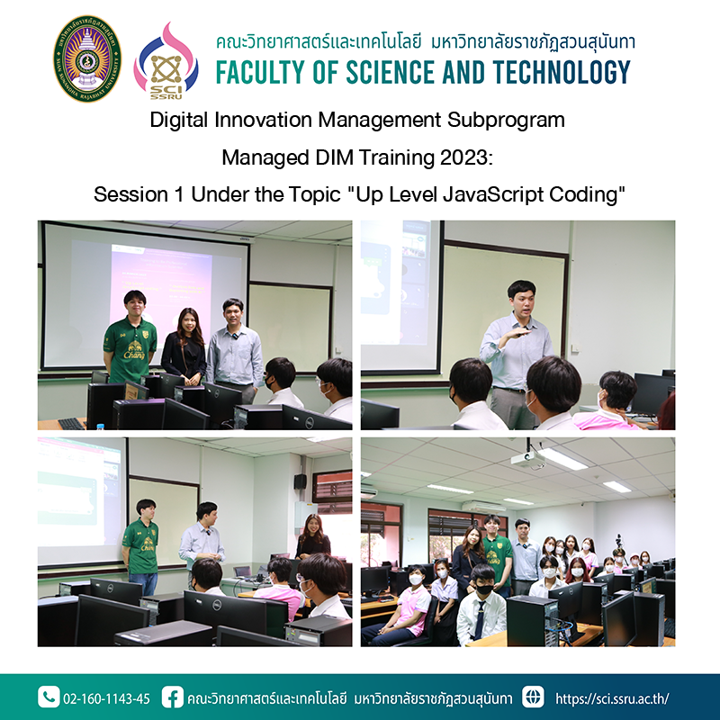 On 16th from 9.00 a.m. – 12.00 a.m., the Digital Innovation Management Subprogram, Digital Innovation and Content Management Program, Faculty of Science and Technology, Suan Sunandha Rajabhat University have managed DIM Training 2023: Session 1 for skills improvement to be Professional Information Scientist. This training is operation training under the topic "Up Level JavaScript Coding" at 26301 Computer Operation Room for 1st year students in the Principles of Object-Oriented Programming Course. This training has the objective of increasing knowledge and improving Principles of Object-Oriented Programming skills with JavaScript coding at a higher level, data update about JavaScript coding’ programmer, information development in the organization, and learning about applied programming for information management in the digital entrepreneur. This training honored Mr.Theerawat Chanjorakhe the Business Intelligence Developer from WP Energy Public Company Limited, and Mr.Pawonprat Saenjit the TH ITBP SCM Officer from Thai Beverage Public Company Limited.