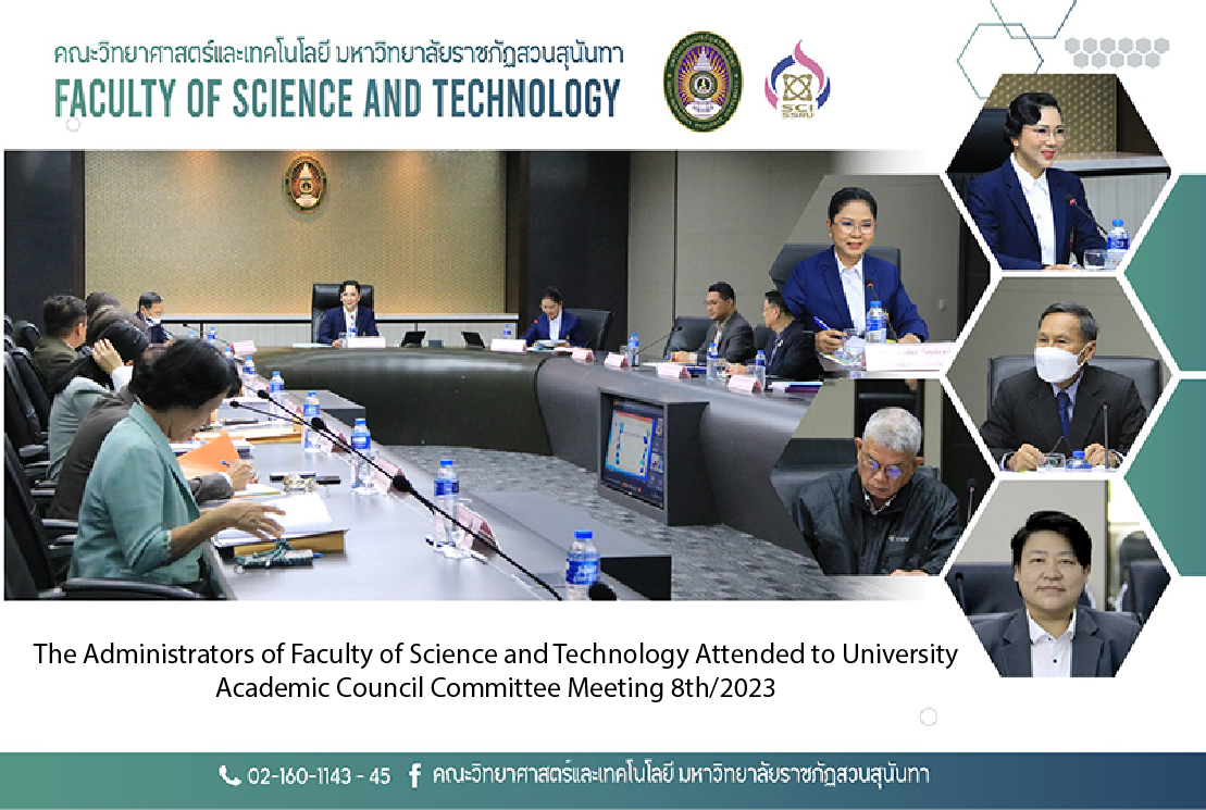 On 15th August 2023, the Faculty of Science and Technology administrators are led by Assistant Professor Dr.Sopid Sawangjit the Deputy Dean for Academic Affairs attended to University Administration Committee Meeting 8th/2023. This meeting has Associate Professor Dr.Chutikarn Sriviboon the President of Suan Sunandha Rajabhat University as chairman. This meeting is organized at University Council Hall, 5th floor, 31 building and Online meeting.