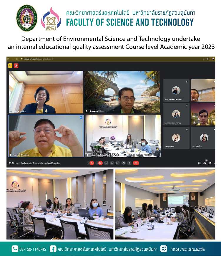 July 17, 2024, led by Assistant Professor Dr.Walaiporn Phonpan, Head of the Department of Environmental Science and Technology welcoming the evaluation committee and report on the performance of the field of study along with lecturers in the field of environmental science and technology Faculty of Science and Technology Suan Sunandha Rajabhat University participate in welcoming and receiving internal educational quality assessments Course level Academic year 2023 It was honored by the evaluation committee, consisting of 3 people, namely Professor Dr. Chamlong Phoboon (Chairman), Associate Professor Dr.Jurairat Duangduean (Committee), Assistant Professor Dr.Teeravej Thitsisaeng (Committee) and Professor Jirawat Sudsawat (Secretary) at meeting room 26109, 1st floor, Faculty of Science and Technology Suan Sunandha Rajabhat University and online via Google Meet.