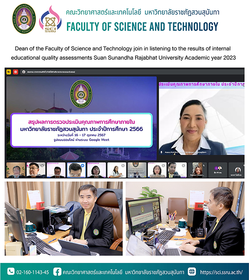 October 17, 2024 at 11:00 a.m. Associate Professor Dr.Chaisri Tarasawatpipat Dean of the Faculty of Science and Technology joined in listening to the results of internal educational quality assessments. Suan Sunandha Rajabhat University Academic year 2023 with Associate Professor Dr.Chutikarn Sriwiboon, Rector, presided over the ceremony.