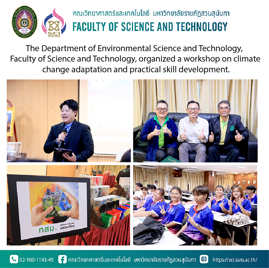 On February 18, 2025, at 9:00 AM, the Department of Environmental Science and Technology, Faculty of Science and Technology, organized a workshop aimed at enhancing knowledge and practical skills in climate change and environmental management through learning activities and hands-on work. The event was presided over by Assistant Professor Dr. Sopit Sawangjit, the Deputy Dean for Research and Academic Services, and was held at Meeting Room 26103, Building 26, Faculty of Science and Technology.