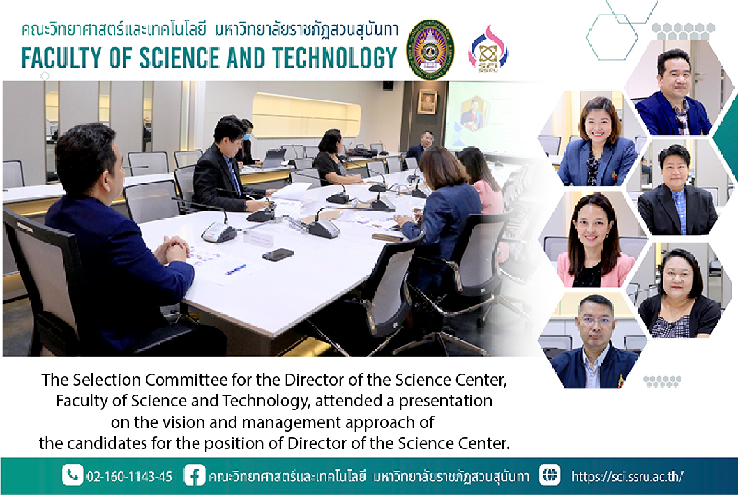 On February 18, 2025, at 9:30 AM, Assistant Professor Dr. Chinwat Sasananan, Dean of the Faculty of Science and Technology, in his capacity as the Chairman of the Selection Committee, together with Associate Professor Dr. Nich Wongsojaja, Vice Dean for Administration, Assistant Professor Dr. Sopit Sawangjitr, Vice Dean for Research and Academic Services, Assistant Professor Dr. Phanthip Gahi, Vice Dean for Business Development and Revenue Generation, and Ms. Kamolthip Satbuts, Committee Member and Secretary, attended the presentation of vision and management approach by Associate Professor Siwaphan Chuin, the candidate for the position of Director of the Science Center, at Meeting Room 26109, Building 26, 1st Floor, Faculty of Science and Technology, Suan Sunandha Rajabhat University.