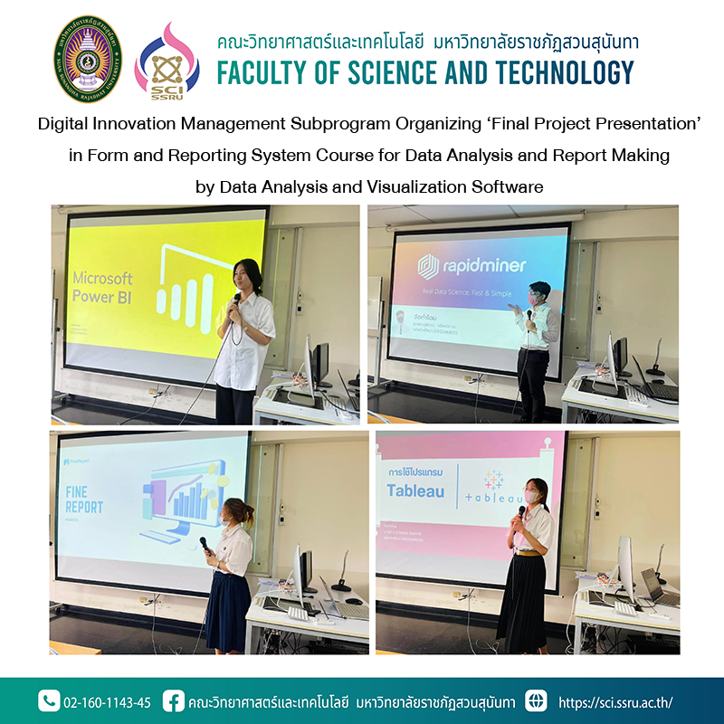 On 17th March 2023, 3rd year students’ Digital Innovation Management Subprogram, Faculty of Science and Technology, Suan Sunandha Rajabhat University have organizing ‘Final Project Presentation’ in Form and Reporting System Course for Data Analysis and Report Making by Data Analysis and Visualization Software.