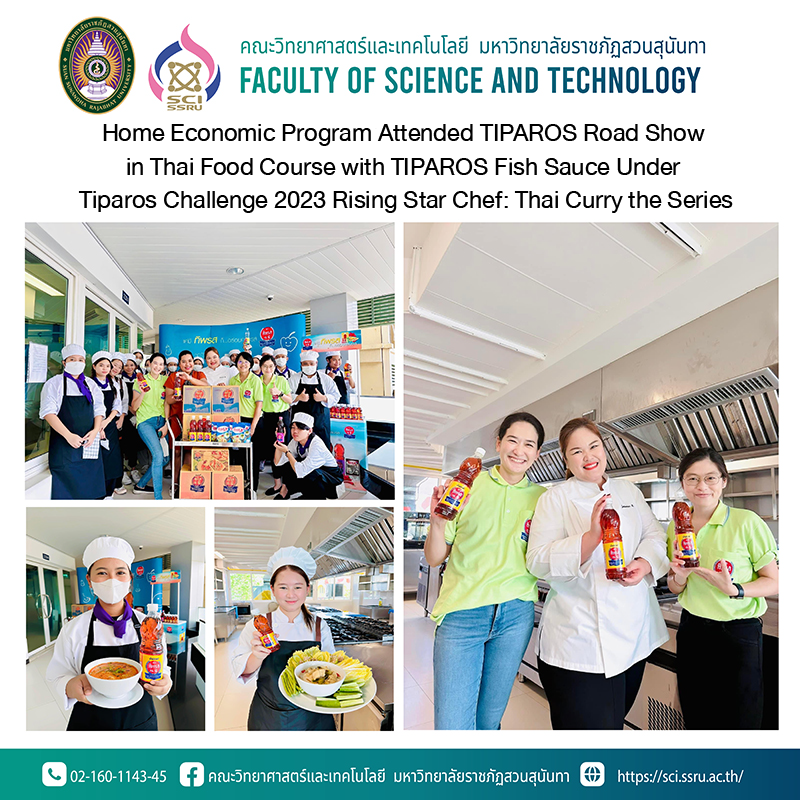 On 16th March 2023, Tang Sang Hah Co., Ltd., fish sauce producer Tiparos brand has organizing TIPAROS Road Show in Thai Food Course with TIPAROS Fish Sauce Under Tiparos Challenge 2023 Rising Star Chef: Thai Curry the Series. They are important to feel appreciated at cook food just give fish sauce products Tiparos brand to the university for study in a Thai food course, and take students to upload their clips or cooked food recipes pictures at the Faculty of Science and Technology, Suan Sunandha Rajabhat University.