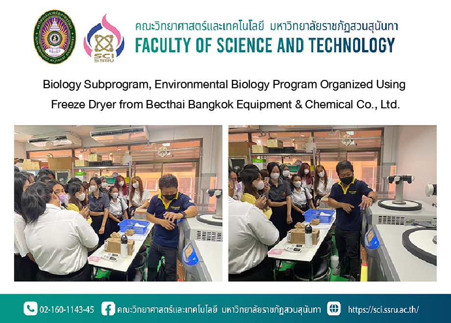 On 9th March 2023, Biology Subprogram, Environmental Biology Program, Faculty of Science and Technology, Suan Sunandha Rajabhat University organized using Freeze Dryer from Becthai Bangkok Equipment & Chemical Co., Ltd. to the students at Molecular Laboratory, 4th floor, Faculty of Science and Technology.
