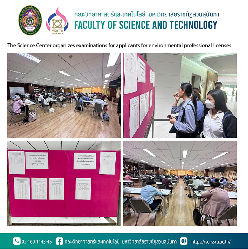 Last Saturday, November 18, 2023, the Science Center Faculty of Science and Technology Suan Sunandha Rajabhat University which is the examination organ of the Council of Science and Technology Professions An examination has been arranged for those applying for licenses to practice science and technology Environmental Impact Assessment Branch (Specialist) Water Pollution Control Branch Air pollution control branch Noise and vibration pollution control branch and the solid waste and sewage control branch at meeting room 26103, Faculty of Science and Technology.