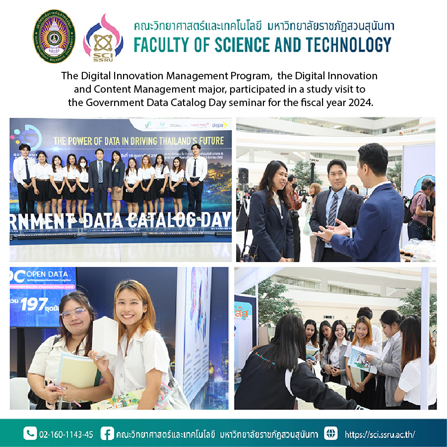 On February 19, 2025, from 09:00 AM to 04:00 PM. The delegation was led by Assistant Professor Dr. Natphat Kaewrattanapat, Vice President for Academic Affairs at Suan Sunandha Rajabhat University, along with Associate Professor Phatchaya Chiewchan, Assistant Dean for Student Affairs, and students from the Digital Innovation Management Program, Faculty of Science and Technology. They attended the seminar and visited exhibition booths from various government and private sector agencies at the activity hall, 2nd floor, the Government Complex Commemorating His Majesty the King’s 80th Birthday, 5 December 2007, Chaeng Watthana Road, Thung Song Hong, Lak Si District, Bangkok.