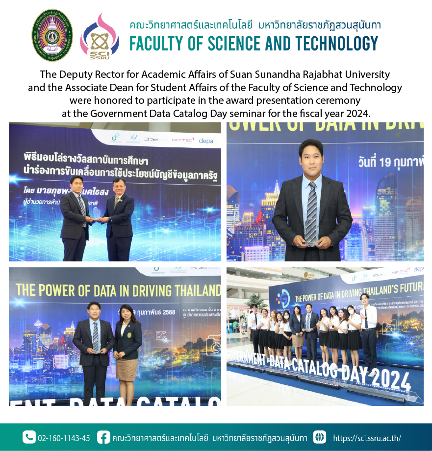 The Deputy Rector for Academic Affairs of Suan Sunandha Rajabhat University and the Associate Dean for Student Affairs of the Faculty of Science and Technology were honored to participate in the award presentation ceremony at the Government Data Catalog Day seminar for the fiscal year 2024.