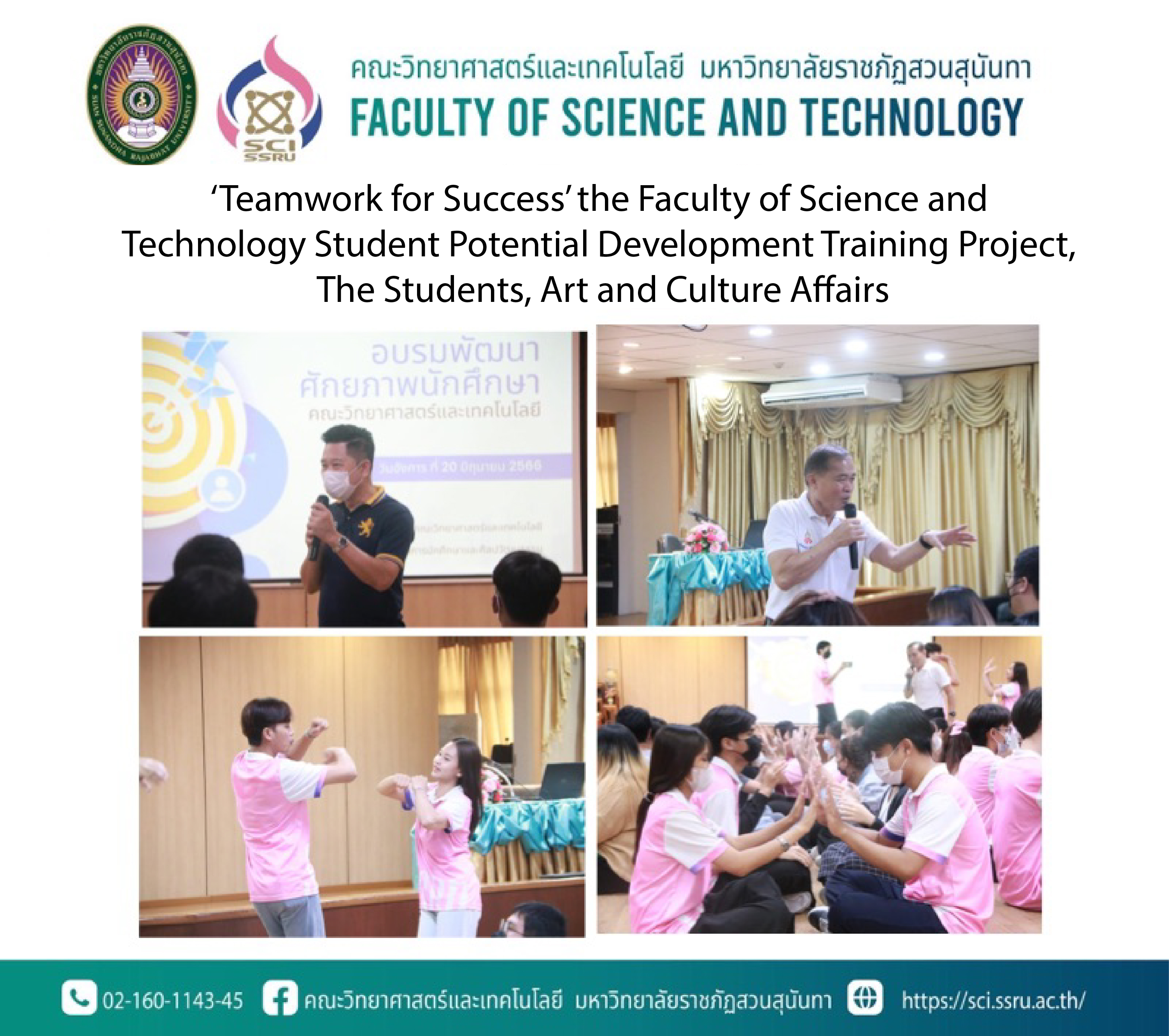On 20th June 2023, the Students, Art and Culture Affairs, Faculty of Science and Technology, Suan Sunandha Rajabhat University organized the Faculty of Science and Technology Student Potential Development Training Project to promote students to develop teamwork skills, Leadership skills, and responsible. This project honored Assistant Professor Thanadej Posri the lecturer of the Sport Science and Health program as an Expert at 26103 meeting room, 1st floor, Faculty of Science and Technology.