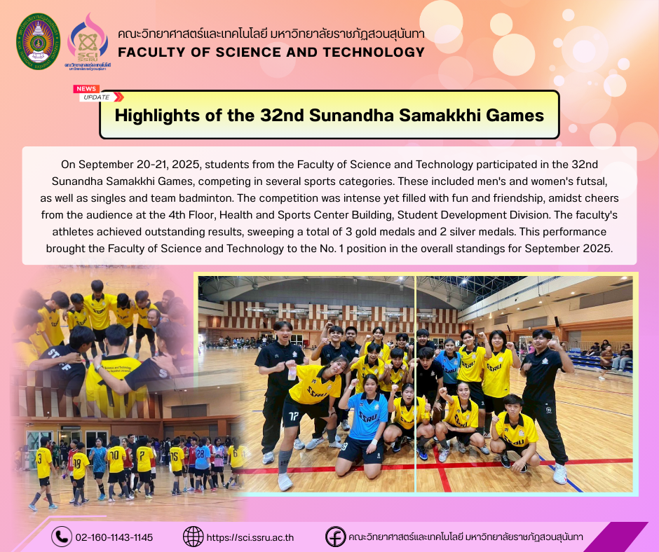 On September 20-21, 2025, students from the Faculty of Science and Technology participated in the 32nd Sunandha Samakkhi Games, competing in several sports categories. These included men's and women's futsal, as well as singles and team badminton. The competition was intense yet filled with fun and friendship, amidst cheers from the audience at the 4th Floor, Health and Sports Center Building, Student Development Division. The faculty's athletes achieved outstanding results, sweeping a total of 3 gold medals and 2 silver medals. This performance brought the Faculty of Science and Technology to the No. 1 position in the overall standings for September 2025.