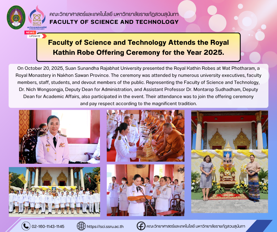On October 20, 2025, Suan Sunandha Rajabhat University presented the Royal Kathin Robes at Wat Photharam, a Royal Monastery in Nakhon Sawan Province. The ceremony was attended by numerous university executives, faculty members, staff, students, and devout members of the public. Representing the Faculty of Science and Technology, Dr. Nich Wongsongja, Deputy Dean for Administration, and Assistant Professor Dr. Montarop Sudhadham, Deputy Dean for Academic Affairs, also participated in the event. Their attendance was to join the offering ceremony and pay respect according to the magnificent tradition.