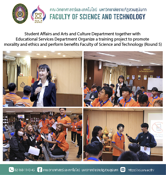 On Thursday, March 21, 2024 from 9:00 a.m. - 12:00 p.m., the Student Affairs and Arts and Culture Department together with the Educational Services Department Faculty of Science and Technology has organized a training project to promote morality and ethics and perform benefits (morning session) for first-year students in the Sports Science and Health Department by being honored by Professor Rassarin Thonsena came to lecture and give knowledge on the topic “Professional morality and ethics of students Faculty of Science and Technology” at meeting room 26103, 1st floor, Building 26, Faculty of Science and Technology Suan Sunandha Rajabhat University.