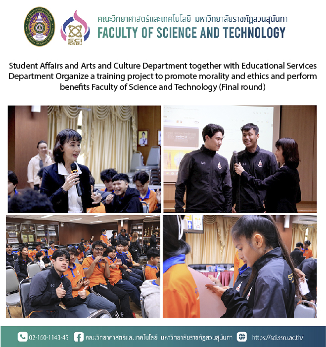 On Thursday, March 21, 2024 at 1:30-4:30 p.m., the Student Affairs and Arts and Culture Department together with the Educational Services Department Faculty of Science and Technology has organized a training project to promote morality and ethics. and perform a service (afternoon session) for first-year students in the field of sports science and health by being honored by Professor Rassarin Thonsena came to lecture and give knowledge on the topic “Professional morality and ethics of students Faculty of Science and Technology” at meeting room 26103, 1st floor, Building 26, Faculty of Science and Technology Suan Sunandha Rajabhat University.