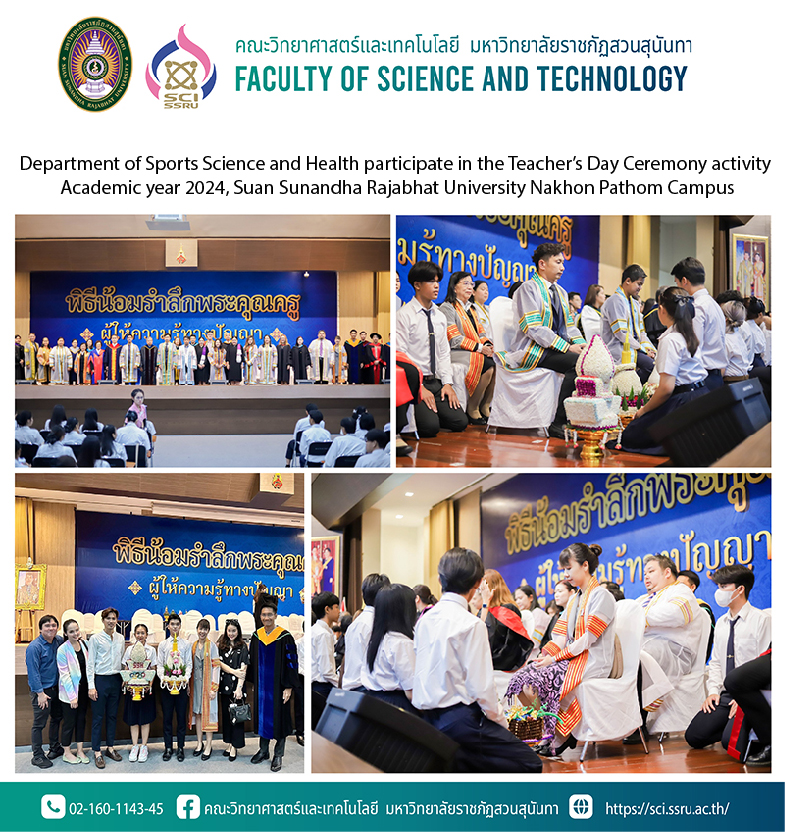 Thursday, August 22, 2024 from 8:00 a.m. - 10:30 a.m., led by Lecturer Dr.Sunisa Rachiwong, Head of the Department of Sports and Health Sciences along with Assistant Professor Dr.Suriyan Sompong, Director of the Center. Olympiad Education and full-time lecturer in the field of sports science and health participate in Teacher’s Day Ceremony activity Academic year 2024, Suan Sunandha Rajabhat University Nakhon Pathom Campus, with Assistant Professor Dr.Kaenphet Saranontawat, Vice President of Nakhon Pathom Campus presided over the ceremony at the auditorium of the multi-purpose learning building and food court, 2nd floor, Suan Sunandha Rajabhat University Nakhon Pathom Campus.